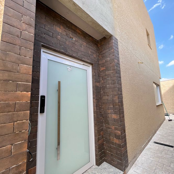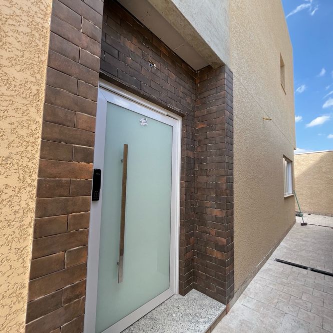Porta pivotante em alumínio (1,20m de largura) com pintura epóxi branca, garantindo imponência já na entrada.