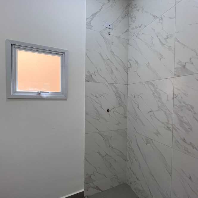Banheiros modernos, com acabamento em porcelanato e nichos elegantes.